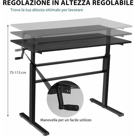 Con questa scrivania lavorerai meglio e senza dolore. La nostra scrivania sit to stand è la scelta perfetta per lavorare comodamente. Realizzata in MDF e struttura in acciaio, è stabile, antiruggine e durevole. L’altezza si regola facilmente per sedersi o stare in piedi (75-113 cm) con la manovella. In questo modo, il collo e la postura saranno rilassati e aumenta l’attenzione e la produttività. Con lo stile semplice ed elegante, è ideale per camera da letto, studio, ufficio, ecc.