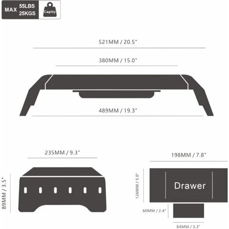 【DETTAGLI TECNICI】Dimensione: 52cm (lunghezza) x 23,5cm (larghezza) x 8,9cm (altezza). Capacità massima: 20kg. Pannello MDF di alta qualità, superficie fine, resistente all’acqua e ai graffi, molto facile da pulire.