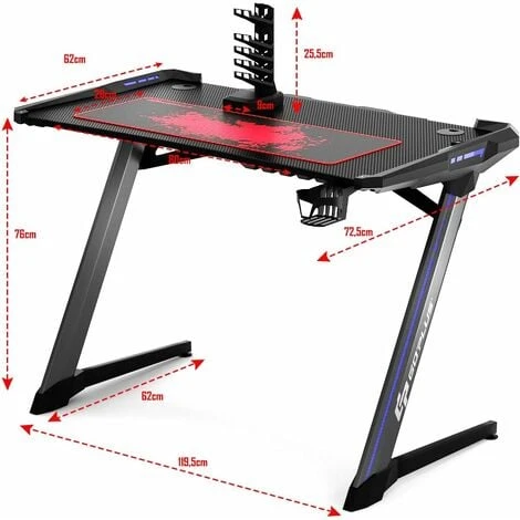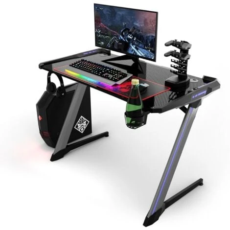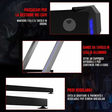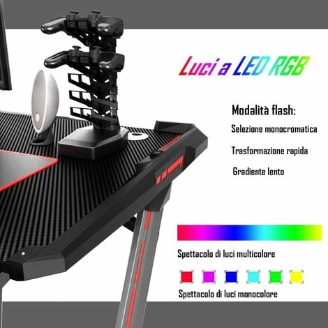 Questa è la nostra nuova scrivania da gaming che si adatta alle esigenze dei gamer. Dotata di porta bicchiere, 2 porta auricolari e un porta USB, la scrivania permette di avere tutta l’attrezzatura da gaming a portata di mano. La superficie della scrivania è realizzata in fibre di carbonio ed è molto spaziosa per contenere monitor, PC, computer e altoparlante. Le luci RGB in 6 colori e le 3 modalità di flash danno una maggiore atmosfera da gaming alla stanza. La forma a Z data dalle gambe in lega di alluminio e dalla struttura in acciaio garantisce la stabilità della scrivania che regge fino a 150kg di peso. Una pratica scrivania da gaming per giocare nel tempo libero!