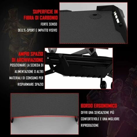 Scrivania spaziosa: La superficie della scrivania è abbastanza spaziosa per contenere monitor, tastiere e altra attrezzatura da gaming. Inoltre, la superficie è realizzata in fibre di carbonio, è liscia al tatto e si pulisce facilmente.