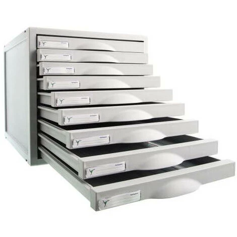 Modulo di 9 cassetti. Cassetti validi per il formato DIN A4. 9 cassetti da 22 mm. Dimensioni interne dei cassetti da 22 mm: 322 x 265 x 22 mm (profondità x larghezza x altezza). Include il titolare della carta d’identità in tutti i cassetti.