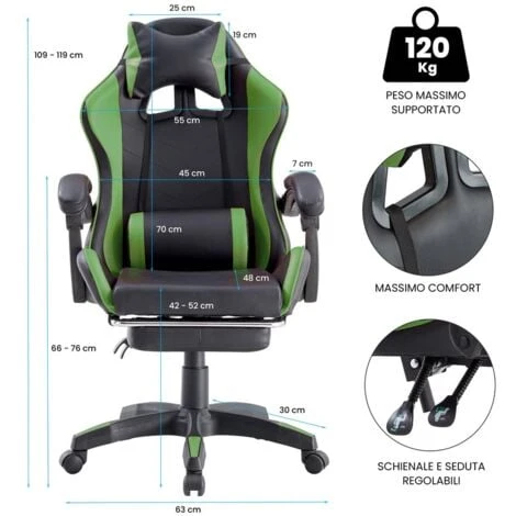 Con la sedia gaming stare lunghe ore alla scrivania per lavoro o per svago non sarà più un problema. La struttura in polipropilene fa da base a una poltrona fatta da comodissimi cuscini rivestiti da pvc. Se a questo si aggiunge la presenza del comodissimo poggiapiedi e la reclinazione regolabile dello schienale, la nuova poltrona da gaming appare in tutta la sua potenziale comodità.
