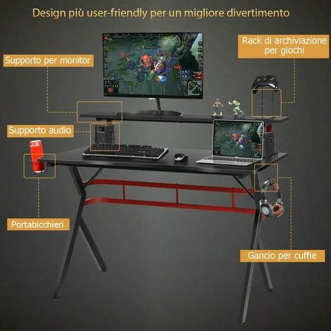 Design comodo per giocare: Con un porta bicchiere, un gancio per le cuffie e una mensola per i videogiochi, la scrivania da gaming ti aiuta ad avere una bellissima esperienza di gioco. Il design facile da usare con un sistema per ordinare i cavi, libera lo spazio dalla scrivania e permette di avere tutto il necessario a portata di mano.