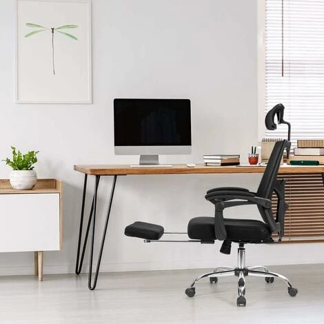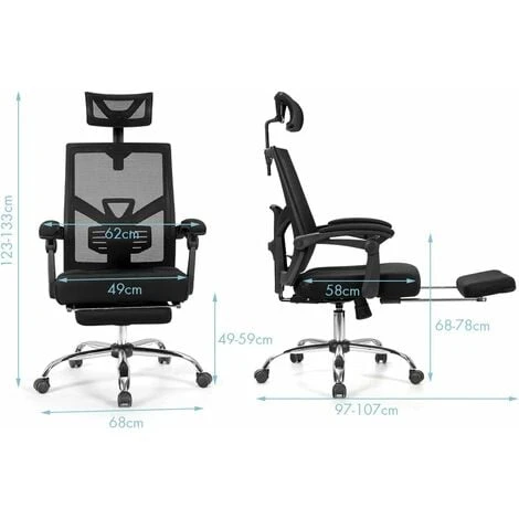 Siediti comodamente a casa e in ufficio con questa sedia! È ergonomica e si adatta perfettamente al corpo e il supporto lombare allevia i dolori alla schiena. L’altezza del sedile e il poggiapiedi si adattano all’altezza della scrivania. Il sedile girevole è imbottito con una spugna ad alta densità spessa 7 cm e ricoperto da un tessuto nero a rete. Le 5 ruote si muovono facilmente sul pavimento. Dal design moderno, è ideale per casa e ufficio.